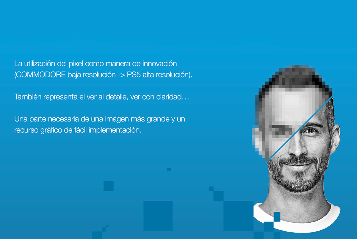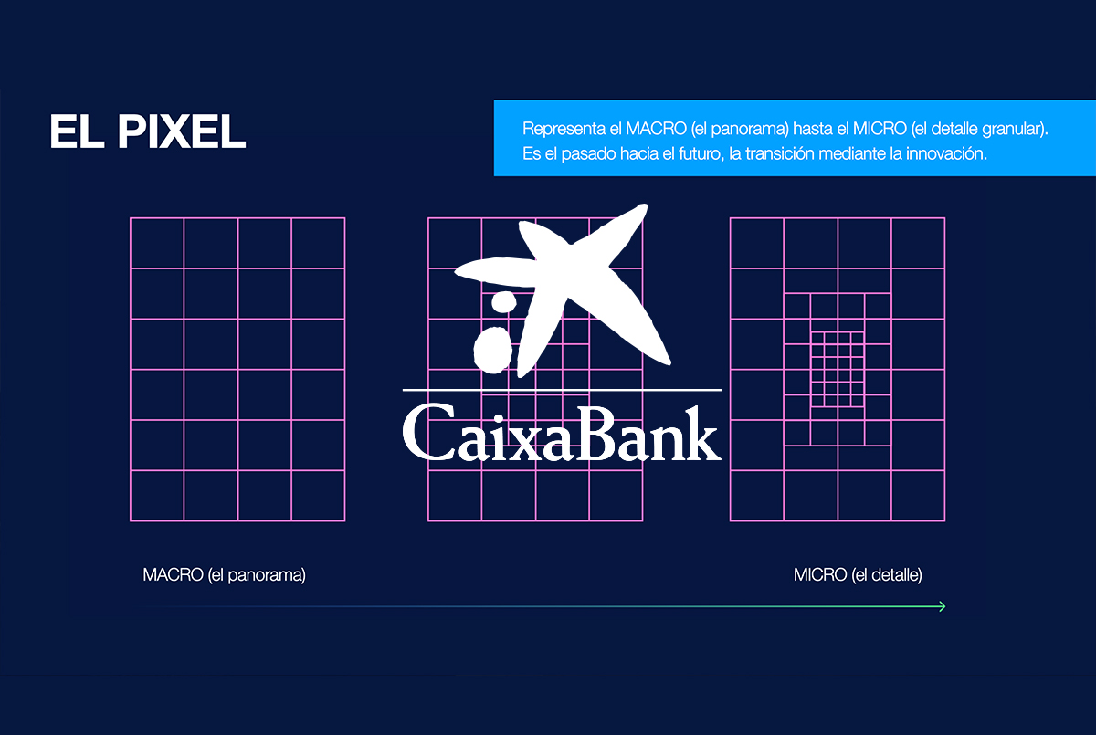 Concepto Gráfico: utilización del Pixel como piedra angular del evento, el paso del MACRO (el panorama) MICRO (el detalle) Representa el MACRO (el panorama económico) hasta el MICRO (el detalle granular, la atención al cliente). Es el pasado hacia el futuro, la transición mediante la innovación.