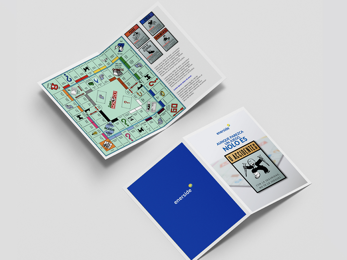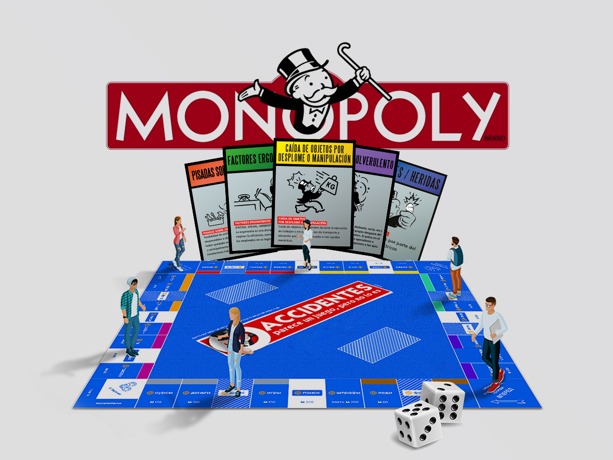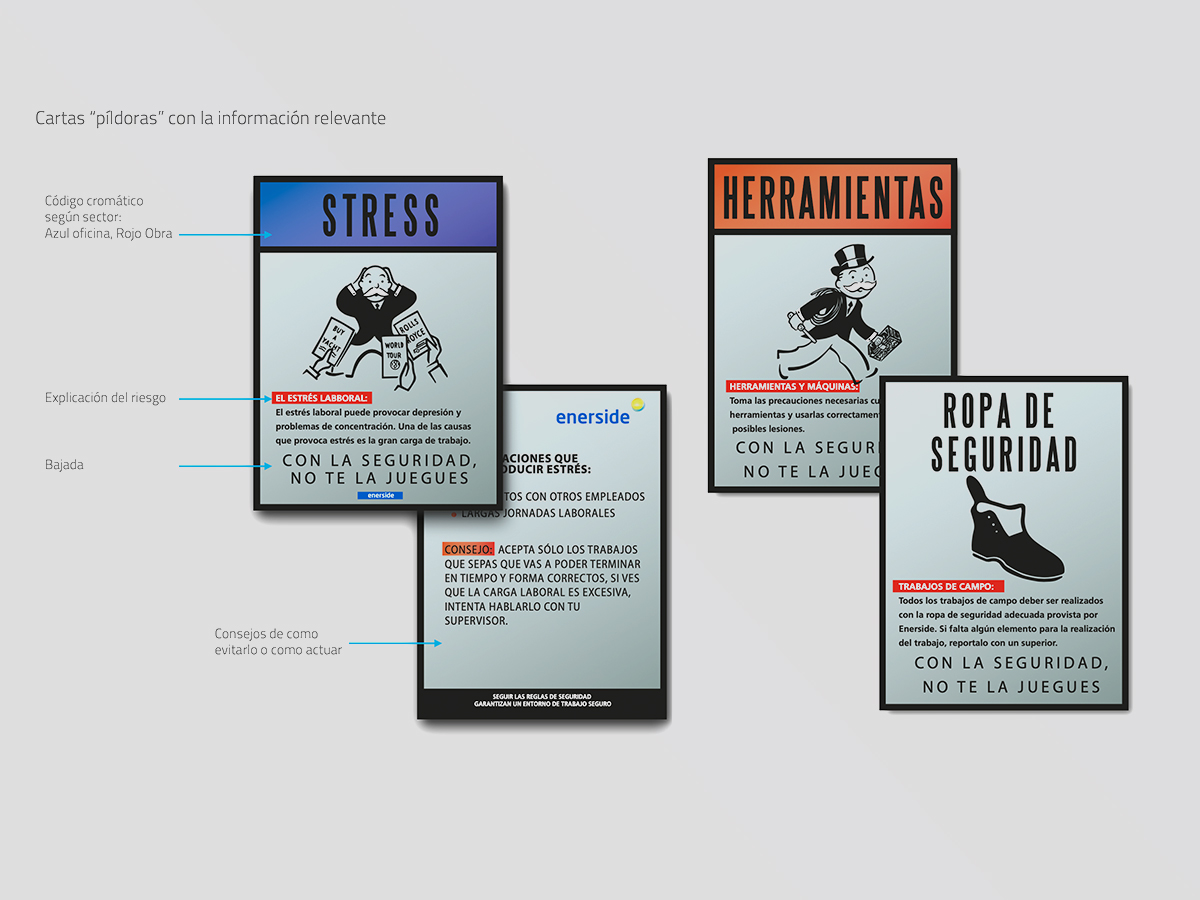 Con el criterion Seguridad – juego tomaremos como punto de partida un juego conocido, el monopoly, como fuente estética de la campaña. Utilizaremos las distintas cartas del monopoly para ir informando de una forma amena los pildorazos de información sobre la seguridad en el trabajo. Finalmente y, con la conjunción de las “cartas” podremos hacer un símil de tablero del monopoly donde estará toda la información. Mediante el código cromático de cada carta podremos identificar a quién esta dirigida cada píldora: i.e. Rojo Personal de campo, Azul personal Administrativo etc.